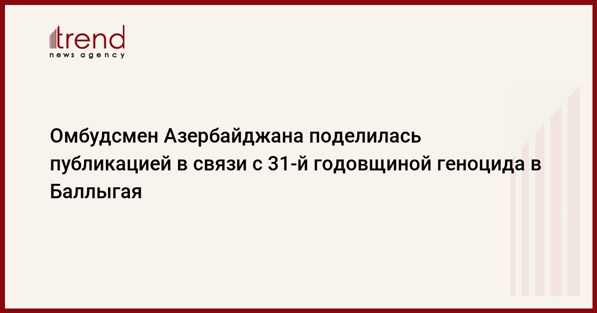 Как сообщает в понедельник Trend, об этом говорится в публикации в Facebook уполномоченного по правам человека Азербайджана (омбудсмена) Сабины Алиевой в связи с 31-й годовщиной геноцида в Баллыгая.