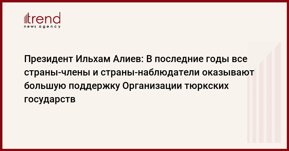 Подчеркнув, что эта поддержка должна оказываться и в последующие годы, Президент Азербайджана отметил: «Сегодня Организация тюркских государств сумела занять достойное место в мировом масштабе. Однако мы должны и впредь активно работать, чтобы наши возможности влияния были еще шире. Здесь, конечно, и взаимопомощь, и в то же время укрепление экономических связей, постоянная координация и проведение консультаций в политической плоскости, взаимопомощь в сфере безопасности - то есть все это важные факторы, которые еще больше укрепят наше единство. Уверен, что позиции и роль нашей организации в мире в ближайшем будущем еще больше возрастут».