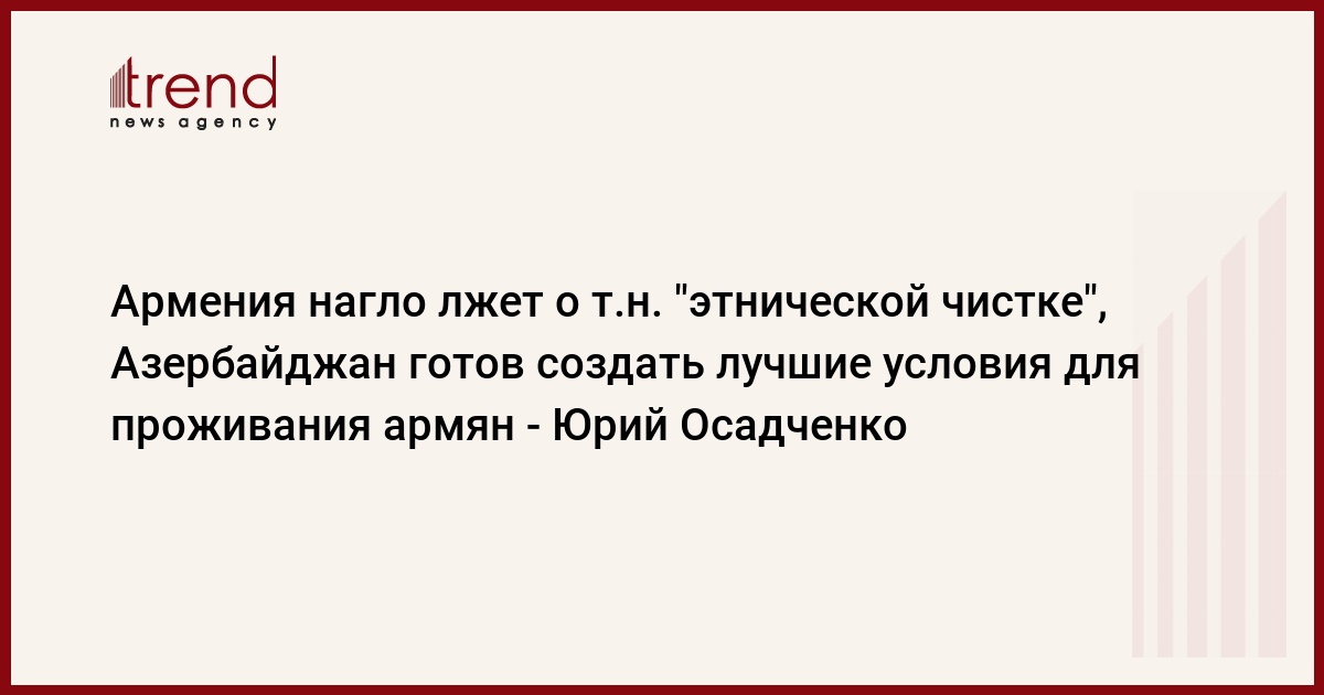 "Армяне так же могут стать частью этого общества и счастливо жить здесь, приняв гражданство и соблюдая законодательство страны. Азербайджан является примером мультикультурализма в мире и нагло обвинять страну в т.н. "этнической чистке" не что иное, как подлость. Мы все прекрасно знаем, что целью этих обвинений является совсем другое. Армяне этим пытаются демонизировать Азербайджан, вредя его имиджу на международной арене, и уговорить некоторые страны выделить средства для содержания так называемых "армянских беженцев", а на деле потратить их на совсем другие цели", - сказал Осадченко.