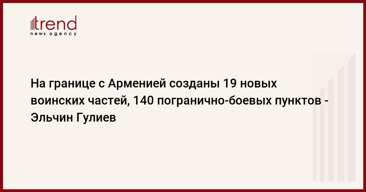 "Построены 19 новых комплексов воинских частей, отвечающих за организацию охраны и обороны государственной границы с Арменией, проходящей через Зангиланский, Губадлинский районы и часть Лачинского района, 140 погранично-боевых пунктов, пункты пропуска через государственную границу "Эйвазлы" и "Газанчы". В международных аэропортах Зангилан и Физули организован пограничный контроль",- заявил Э.Гулиев