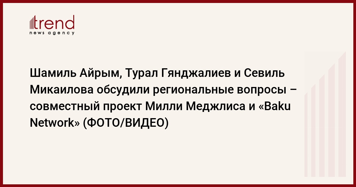 БАКУ /Trend/ - Депутаты Милли Меджлиса Азербайджана Турал Гянджалиев, Севиль Микаилова и сопредседатель турецко-азербайджанской межпарламентской группы дружбы, депутат Шамиль Айрым, представляющий правящую Партию справедливости и развития в Великом национальном собрании Турции, обсудили на платформе "Baku Network"ряд вопросов, представляющих интерес.