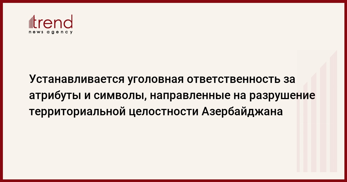 БАКУ /Trend/ - Устанавливается уголовная ответственность за демонстрацию, распространение, изготовление, приобретение, перевозку или ношение атрибутов, символов, направленных на разрушение территориальной целостности Азербайджанской Республики.