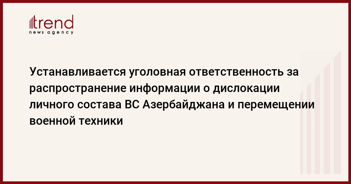 БАКУ /Trend/ - Устанавливается уголовная ответственность за распространение информации о перемещении или дислокации личного состава Вооруженных сил Азербайджанской Республики, военного оружия, боеприпасов или военной техники.