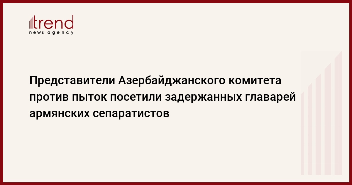 БАКУ /Trend/ - Председатель Азербайджанского комитета против пыток Турал Гусейнов, заместитель председателя Эльчин Ширинов и начальник юридического отдела Ровшан Мамедов посетили содержащихся в Главном следственном управлении Службы государственной безопасности бывших главарей сепаратистского режима Араика Арутюняна, Рубена Варданяна, Давида Манукяна и Леву Мнацаканяна.