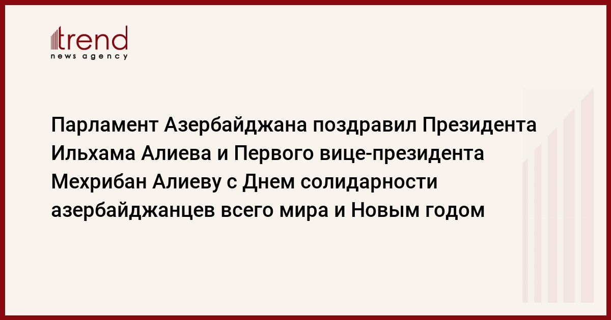 БАКУ /Trend/ - Милли Меджлис (парламент) поздравил Президента Азербайджана Ильхама Алиева и Первого вице-президента Мехрибан Алиеву с Днем солидарности азербайджанцев всего мира и Новым годом.