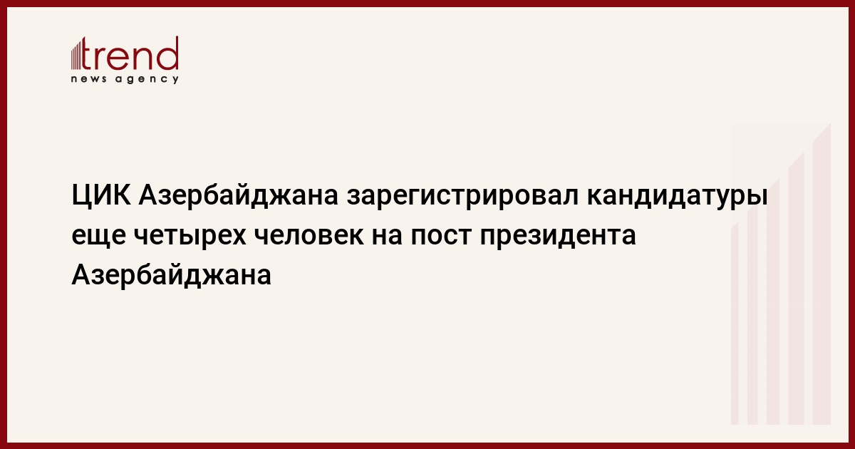БАКУ /Trend/ - Центральная избирательная комиссия (ЦИК) Азербайджана зарегистрировала кандидатуры еще четырех человек на пост президента страны.