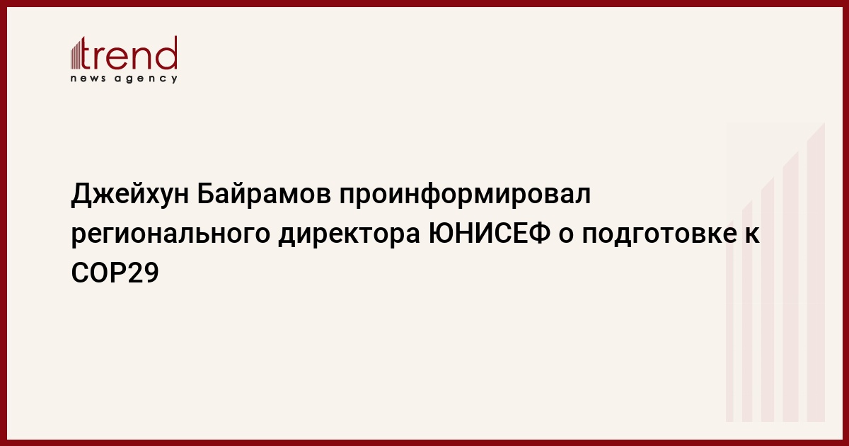 На встрече состоялся обмен мнениями по вопросам, стоящим на повестке сотрудничества между Азербайджаном и ЮНИСЕФ, перспективам дальнейшего сотрудничества, а также по текущей региональной ситуации. Джейхун Байрамов отметил, что Азербайджан с первых дней восстановления своей независимости тесно сотрудничает с различными специализированными структурами ООН, в том числе с ЮНИСЕФ. В частности, были реализованы успешные программы и проекты в области создания лучших образовательных и медицинских возможностей для детей, ставших беженцами и вынужденными переселенцами в результате оккупации Арменией азербайджанских территорий.