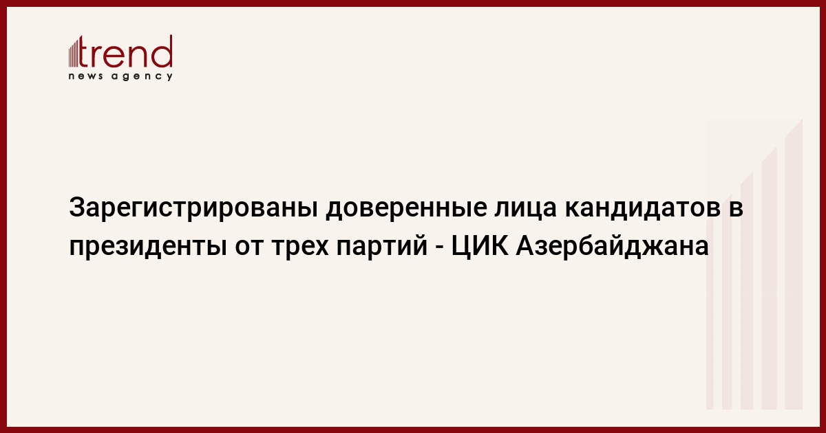 Как сообщает Trend, на заседании ЦИК был рассмотрен вопрос о регистрации доверенных лиц кандидатов в президенты от партии "Великое созидание", партии Единого народного фронта и партии "Великий Азербайджан".