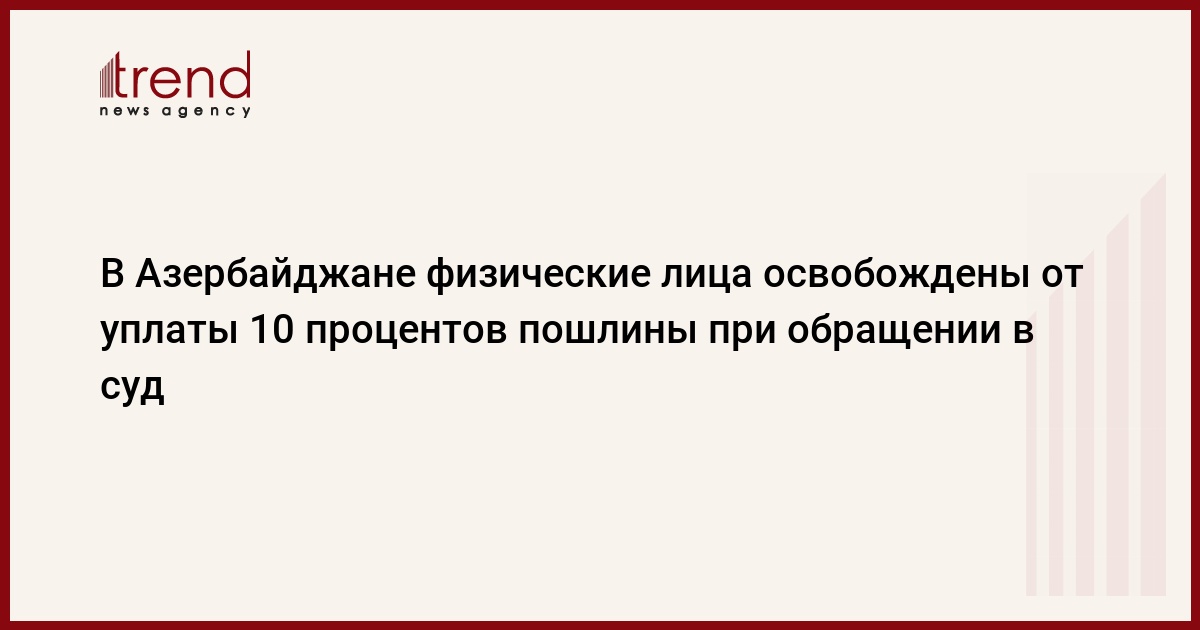 Как сообщает в понедельник Trend, согласно закону, физические лица, впервые обратившиеся с исковым заявлением по гражданским делам в общий суд через информационную систему "Электронный суд", освобождаются от уплаты десяти процентов суммы государственной пошлины, предусмотренной статьей 8 настоящего закона.