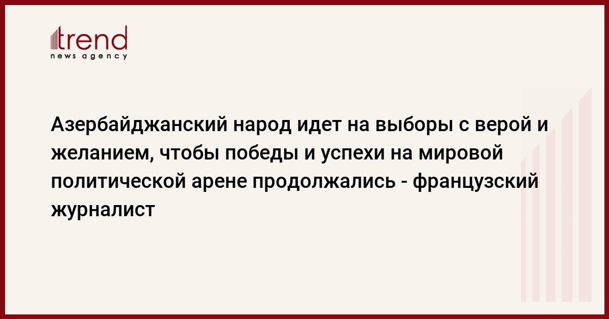 Как сообщает в субботу Trend, главный редактор онлайн-газеты La Gazette du Caucase, базирующейся в Париже, известный французский журналист Жан-Мишель Брюн поделился данным мнением с сайтом secki-2024.az по поводу внеочередных президентских выборов в Азербайджане, назначенных на 7 февраля этого года.