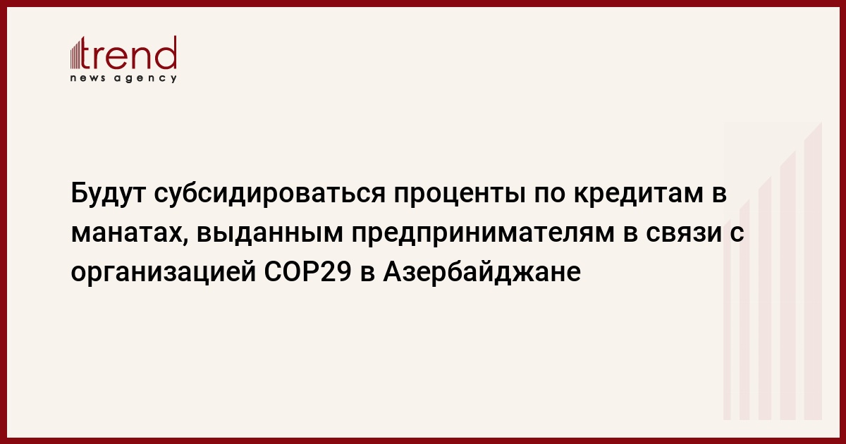 БАКУ /Trend/ - Как сообщалось, Президент Ильхам Алиев подписал указ о субсидировании процентов по кредитам, выдаваемым кредитными организациями предпринимателям в рамках проектов, реализуемых в связи с организацией в 2024 году Азербайджанской Республикой 29-й сессии Конференции сторон Рамочной конвенции Организации Объединенных Наций по изменению климата (COP29), 19-й сессии встречи сторон Киотского протокола и 6-й сессии встречи сторон Парижского соглашения.