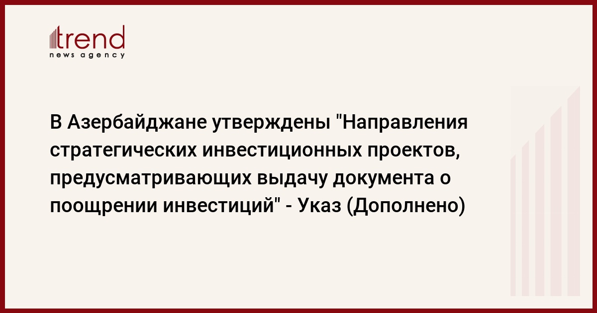 Как сообщает Trend, в соответствии с указом утверждены "Направления стратегических инвестиционных проектов, предусматривающих выдачу документа о поощрении инвестиций".
