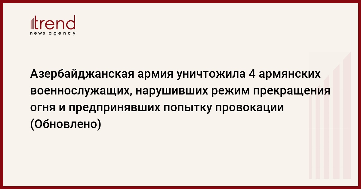 БАКУ /Trend/ - Число уничтоженных военнослужащих Вооруженных сил Армении, которые попытались совершить провокацию с нарушением режима прекращения огня в направлении Гафанского района армяно-азербайджанской условной границы, достигло четырех человек.