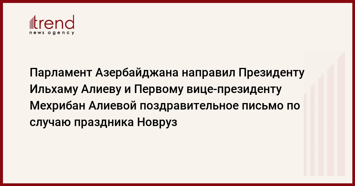 БАКУ /Trend/ - Милли Меджлис (парламент) Азербайджана направил Президенту Ильхаму Алиеву и Первому вице-президенту Мехрибан Алиевой поздравительное письмо по случаю праздника Новруз.