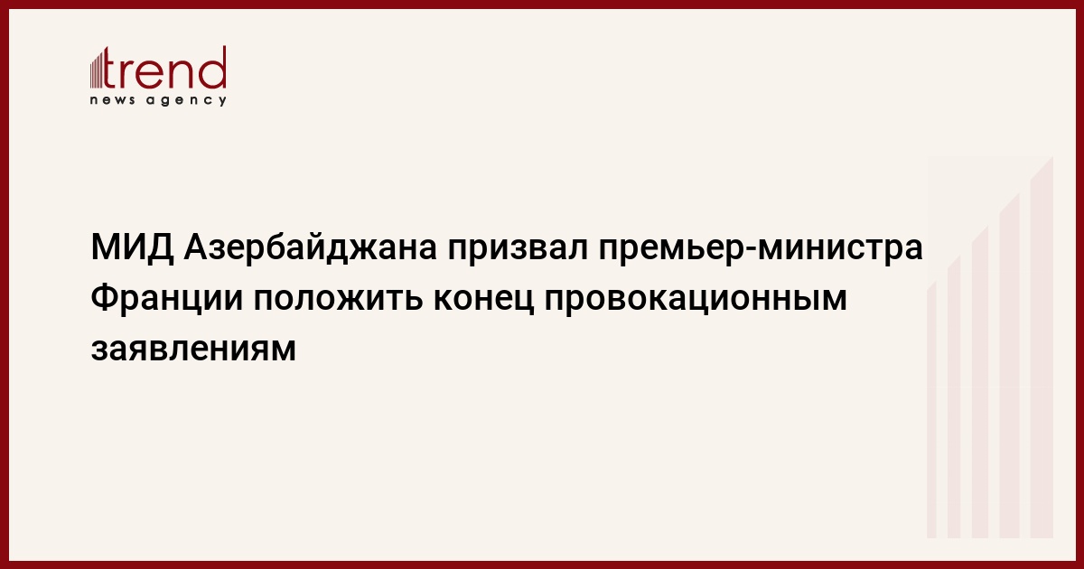 "Премьер-министру Франции, который осудил антитеррористические мероприятия локального характера, проведенные в сентябре прошлого года ВС Азербайджана против остатков вооруженных сил Армении на суверенных территориях Азербайджана, а также обвинил Азербайджан в якобы "оккупации армянских территорий", хотим напомнить, что мероприятия, проведенные азербайджанской стороной, отвечают нормам и принципам международного права, а также положениям резолюции Совета Безопасности ООН, постоянным членом которой является Франция. Абсурдно, что Франция, которая не возражала против продолжавшейся почти 30 лет армянской агрессии и оккупации азербайджанских территорий, а также против того, что в настоящее время Армения все еще держит под оккупацией 8 азербайджанских сел, без каких-либо оснований обвиняет Азербайджан в применении силы. Еще раз призываем французскую сторону извлечь уроки из собственной истории, не вмешиваться во внутренние дела Азербайджана и положить конец подобным провокационным заявлениям", - говорится в сообщении пресс-службы ведомства.