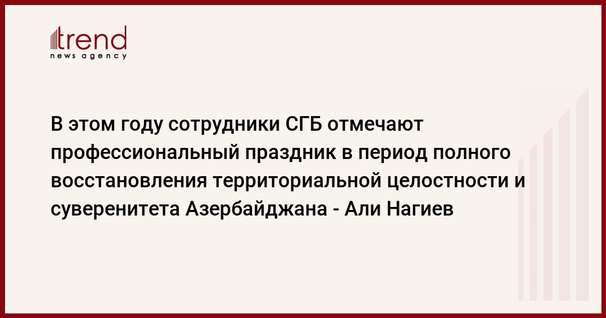 БАКУ /Trend/ - Вызывает гордость то, что сотрудники СГБ, которые постоянно строят свою деятельность на принципах преданности Родине, постоянно сохраняют несокрушимые традиции, заложенные общенациональным лидером Гейдаром Алиевым в данных органах, в этом году отмечают профессиональный праздник именно в то время, когда азербайджанский народ, будучи победителем, испытывает гордость за то, что территориальная целостность и суверенитет страны полностью восстановлены.