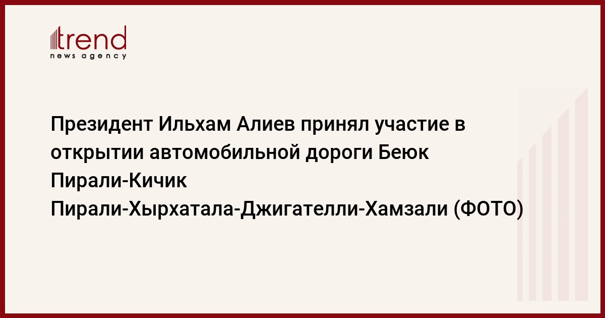БАКУ /Trend/ - 9 апреля Президент Азербайджанской Республики Ильхам Алиев принял участие в открытии автомобильной дороги Беюк Пирали-Кичик Пирали-Хырхатала-Джигателли-Хамзали, начинающейся от 40-го километра дороги Агдаш-Зараган.