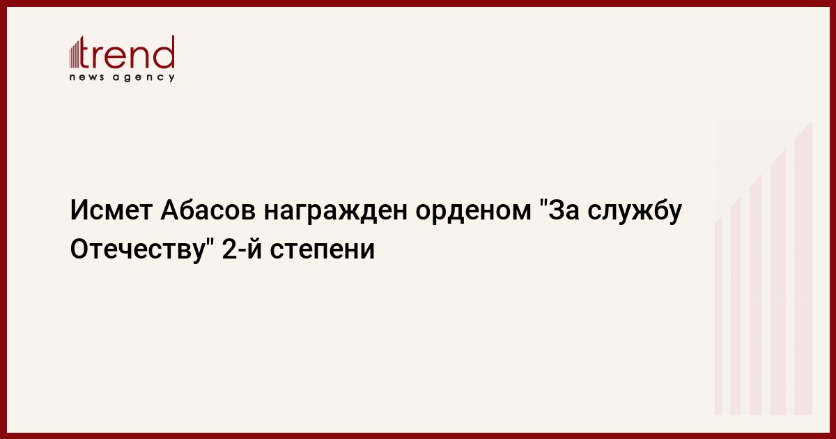 Как сообщает Trend, согласно распоряжению, за плодотворную деятельность в общественной жизни Азербайджанской Республики Исмет Дурсун оглу Абасов награжден орденом "За службу Отечеству" 2-й степени.