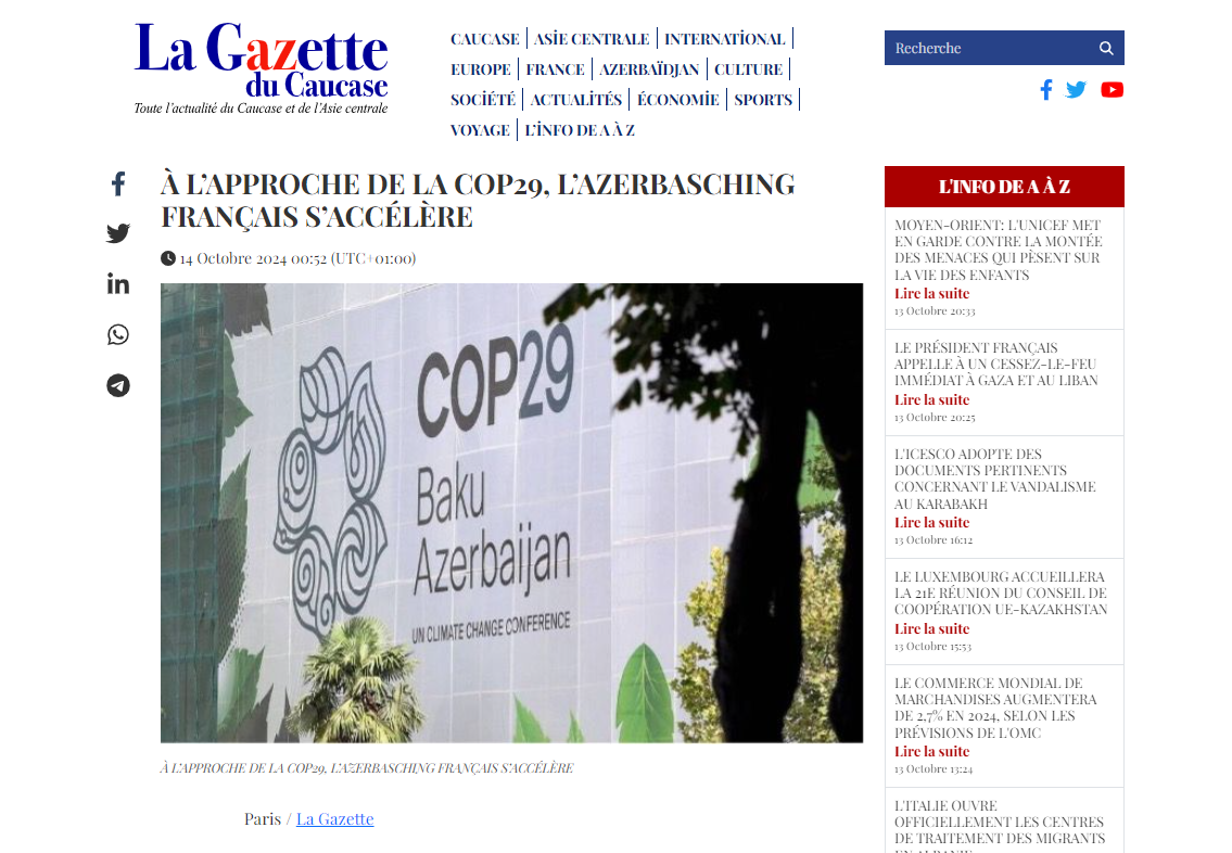 "Франция замечает соринку в глазу Баку, но не видит бревна в своем собственном. Официальные французские СМИ выражают недоумение: как Азербайджан может заявлять о заботе по климатическим вопросам, будучи нефтедобывающей страной? Однако можно возразить, что признание страной-производителем необходимости перехода к устойчивому развитию - это скорее позитивный шаг. Поскольку этот аргумент малоубедителен, те же СМИ, ныне принадлежащие горстке олигархов, идеологически связанных с правыми и открыто исламофобскими взглядами, пытаются разыгрывать армяно-азербайджанский конфликт, искажая факты и называя освобождение Азербайджаном своих территорий, оккупированных в течение 30 лет, агрессией", - отмечается в статье.