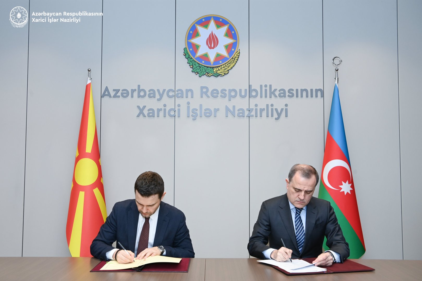 Документ подписали глава МИД Азербайджана Джейхун Байрамов и министр иностранных дел и внешней торговли Северной Македонии Тимчо Муцунский.