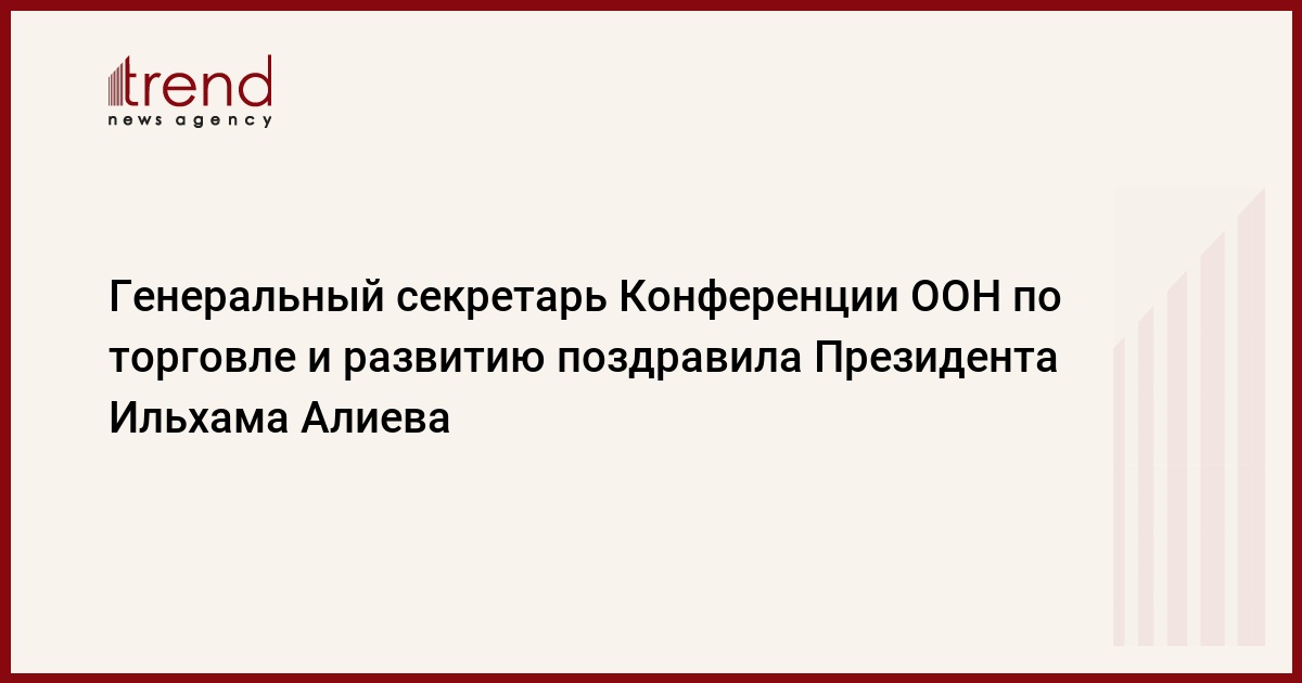БАКУ /Trend/ - Генеральный секретарь Конференции ООН по торговле и развитию Ребеки Гринспан направила поздравительное письмо Президенту Азербайджанской Республики Ильхаму Алиеву.