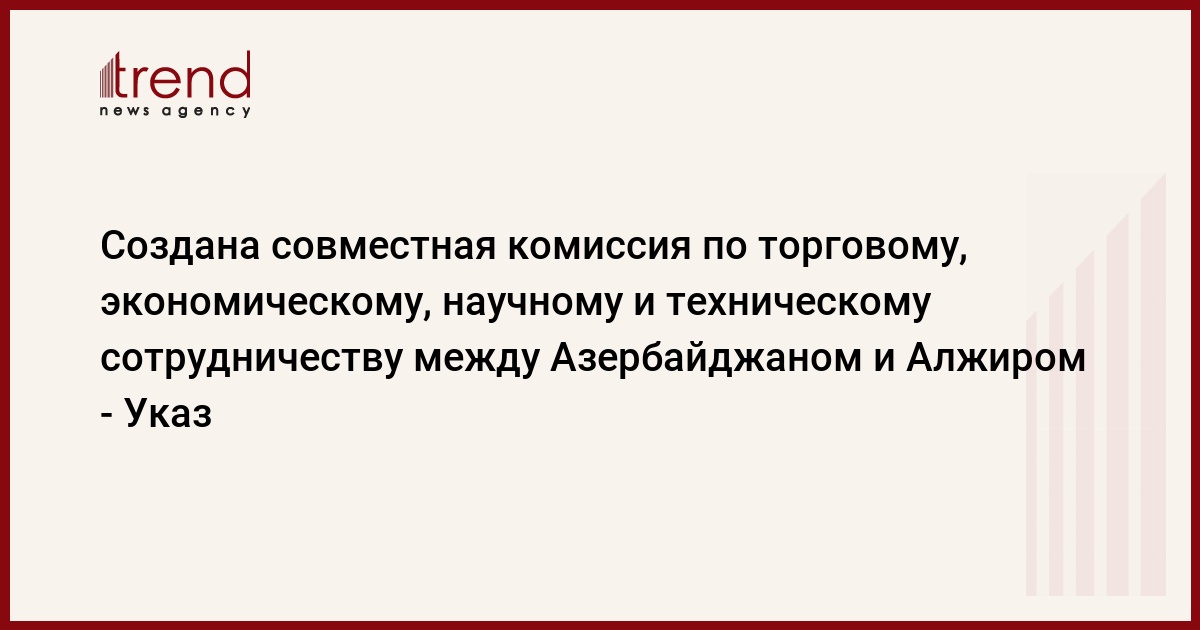 Как сообщает Trend, это отражено в указе Президента Ильхама Алиева об утверждении "Соглашения между Правительством Азербайджанской Республики и Правительством Алжирской Народно-Демократической Республики о создании Совместной комиссии по торговому, экономическому, научному и техническому сотрудничеству".