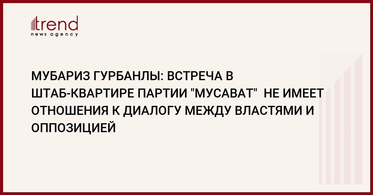 "Партия "Ени Азербайджан", как и планируется, в первой половине августа примет участие в очередной встрече, которая состоится в штаб-квартире партии Гражданской солидарности (ПГС). Об этой встрече информирован также руководитель Бакинского представительства ОБСЕ Маурицио Павеси. "Во время "круглого стола" в ПГС будут обсуждены предвыборная ситуация и проведение не соответствующей нормам этики пропаганды в средствах массой информации. Встреча, которую проведет партия "Мусават", не имеет отношения к диалогу между властями и оппозицией, просто они хотят встретиться и что-то обсудить. Если они хотят проведения диалога между властями и оппозицией, то пусть придут на встречу в ПГС и выскажут свое мнение", - отметил М.Гурбанлы.