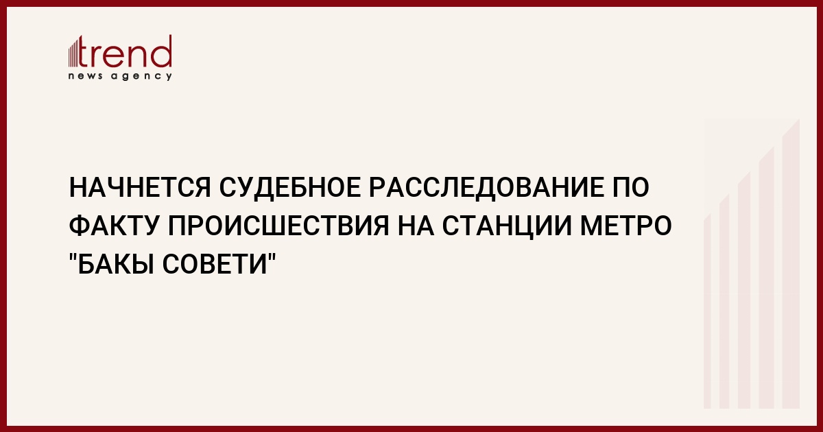 В сообщении говорится, что дело будет рассмотрено в Сабаильском районном суде. Hапомним, что 8 июня в 13.41 в результате аварии эскалатора на станции метро "Бакы Совети" погиб Вахид Ахундов и получили тяжкие увечья 18 человек, в том числе двое малолетних детей.