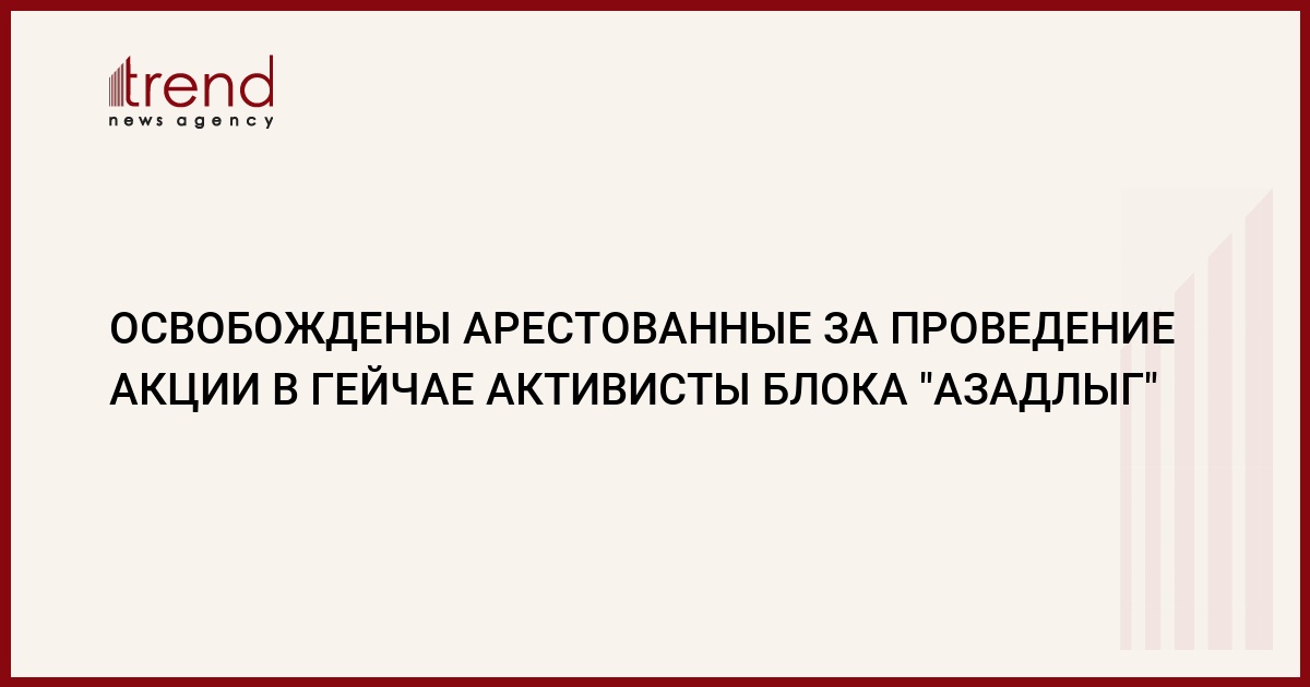 Освобождены активисты блока "Азадлыг", арестованные во время несанкционированного митинга 6 августа в Гейчае. Об этом Trend сообщил председатель Гейчайского отделения партии Hародного фронта (реформаторы) Самид Мамедов.