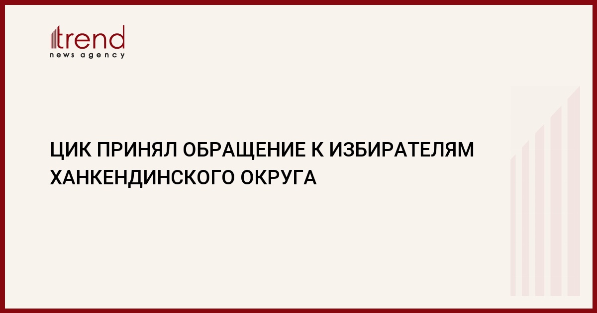 В связи началом деятельности Ханкендинского избирательного округа №122 Центральная избирательная комиссия (ЦИК) приняла обращение к избирателям данного округа. Об этом Trend сообщили в ЦИК.