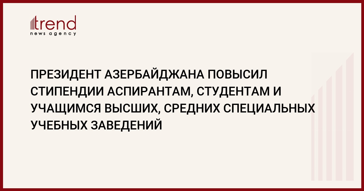 Распоряжением президента Азербайджана Ильхама Алиева от 30 августа студентам и учащимся государственных высших, средних специальных учебных заведений, профессиональных училищ и профессиональных лицеев в 2,5 раза повышены размеры ежемесячных стипендий, а также аспирантам, получающим образование за счет государственного бюджета.