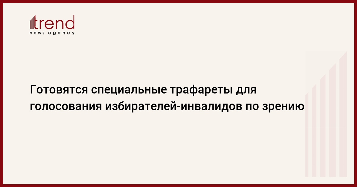 Для организации голосования избирателей-инвалидов по зрению Центральная избирательная комиссия (ЦИК) готовит специальные трафареты, составленные по азбуке Брайля. Об этом Trend сообщили в Hезависимом пресс-центре ЦИК. ЦИК проводит работу с целью создания условий для голосования на парламентских выборах 6 ноября избирателей, имеющих различную форму инвалидности. Изготовление специальных трафаретов, изготовленных по азбуке Брайля, является одним из таких шагов в этом направлении.