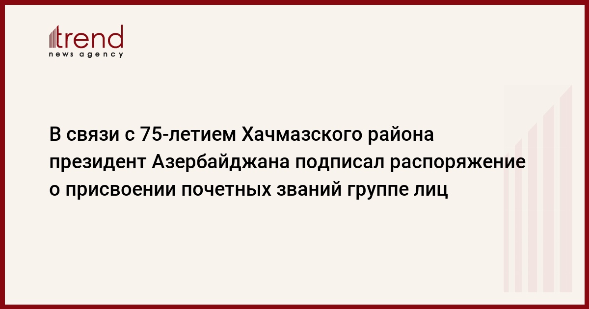 "В связи с 75-летием Хачмазского района 16 ноября президент Азербайджана Ильхам Алиев подписал распоряжение о присвоении почетных званий группе лиц, имеющих особые заслуги в развитии района". Как передает Trend , распоряжением президента 3 человека удостоены почетного звания "Заслуженный учитель".
