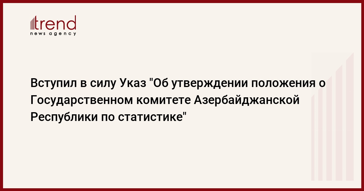 Вступил в силу Указ президента Азербайджана Ильхама Алиева "Об утверждении положения о Государственном комитете Азербайджанской Республики по статистике". Как передает Trend , документ преследует цель усовершенствования нормативно-правовых основ деятельности госкомитета по статистике.