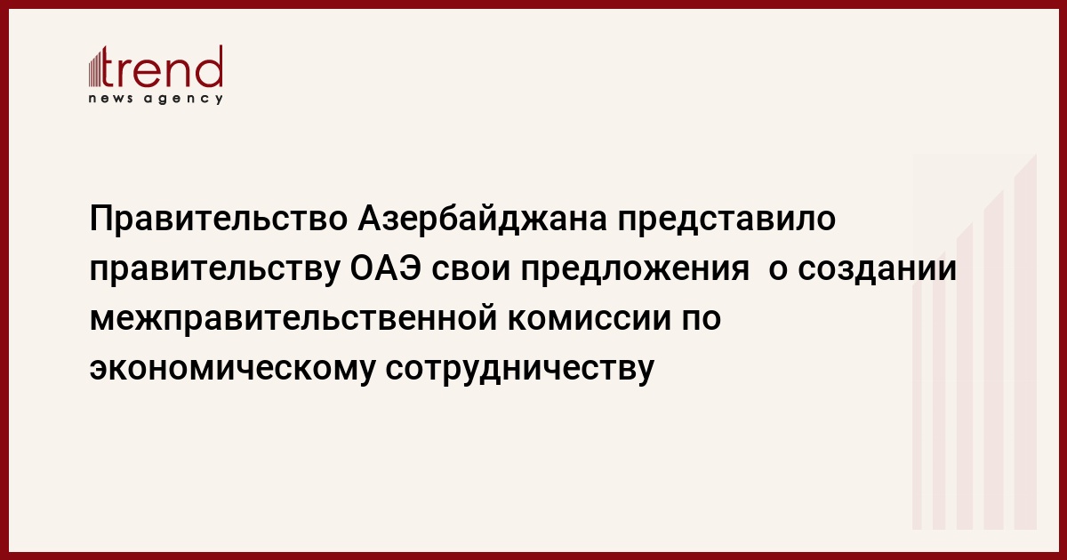 Правительство Азербайджана представило правительству Объединенных Арабских Эмиратов (ОАЭ) свои предложения по созданию совместной межправительственной комиссии по экономическому сотрудничеству. Об этом сообщили Trend в Кабинете министров Азербайджана
