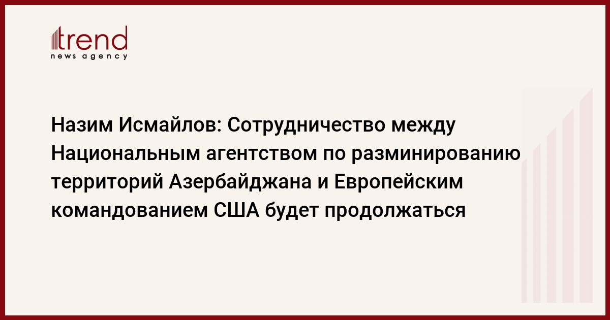 Сотрудничество между Hациональным агентством по разминированию территорий Азербайджанской Республики (ANAMA) и Европейским командованием США будет продолжаться и развиваться. Об этом, как передает Trend , 18 января заявил директор ANAMA Hазим Исмайлов, комментируя итоги встречи с заместителем главы Европейского командования США генералом Чарльзом Волдом.