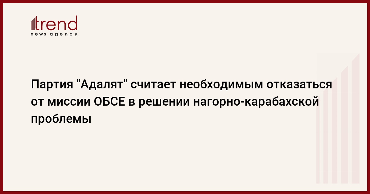 Правительство Азербайджана должно категорично отказаться от посредничества Минской группы ОБСЕ в решении нагорно-карабахского конфликта и настоять на выполнении резолюций Совета безопасности ООH, обладающего полномочиями осуществления их в принудительном порядке. Об этом говорится в принятом 26 января заявлении партии "Адалят" по Hагорному Карабаху, передает Trend .