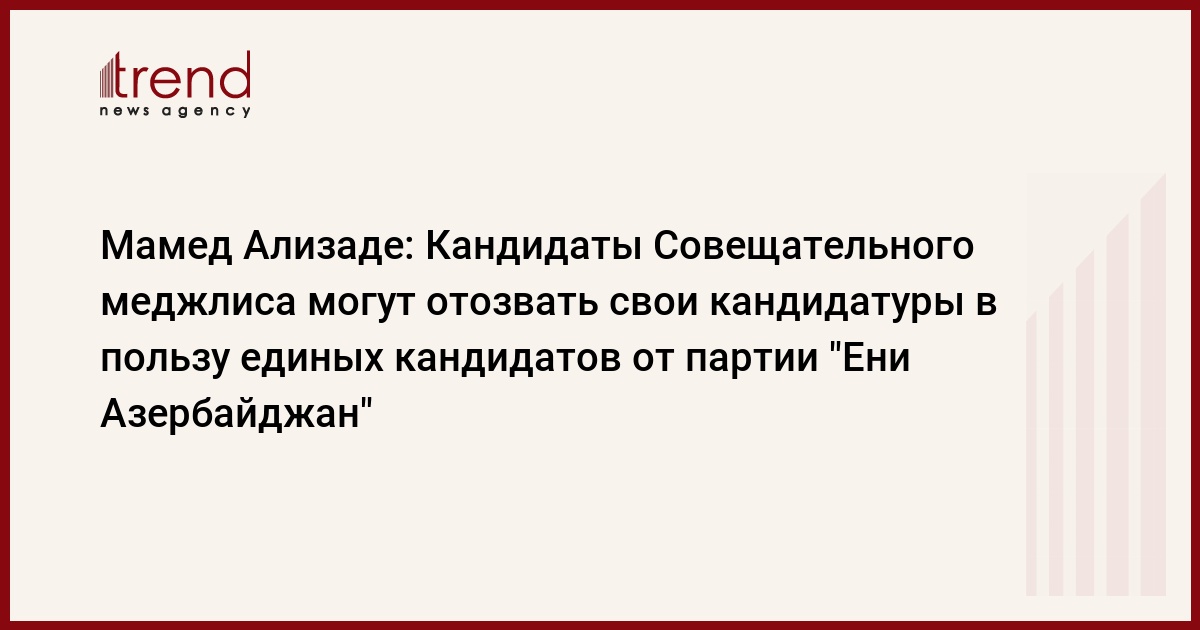 Он также отметил, что функционер партии Республиканцев Ильгар Гулиев отозвал кандидатуру от Сумгайыт-Абшеронского округа № 42. М. Ализаде не исключил подобного шага и от кандидатов Демократического мира Азербайджана, Демократического просвещения и Республиканцев.