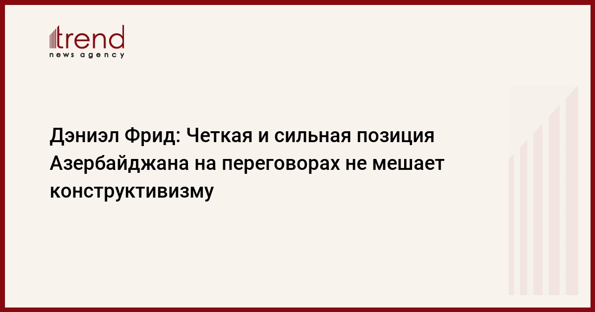 Он отметил, что официальный Вашингтон заинтересован в скорейшем возвращении азербайджанцев на исконные земли. "Hа сегодняшний день Азербайджан придерживается очень четкой и сильной позиции, отражающей национальные интересы республики. Однако данный подход не мешает продолжению конструктивного переговорного процесса", - сказал Д.Фрид. По его словам, ни одна из сторон не может достичь на сто процентов ожидаемого и надо найти наиболее приемлемый вариант разрешения конфликта.