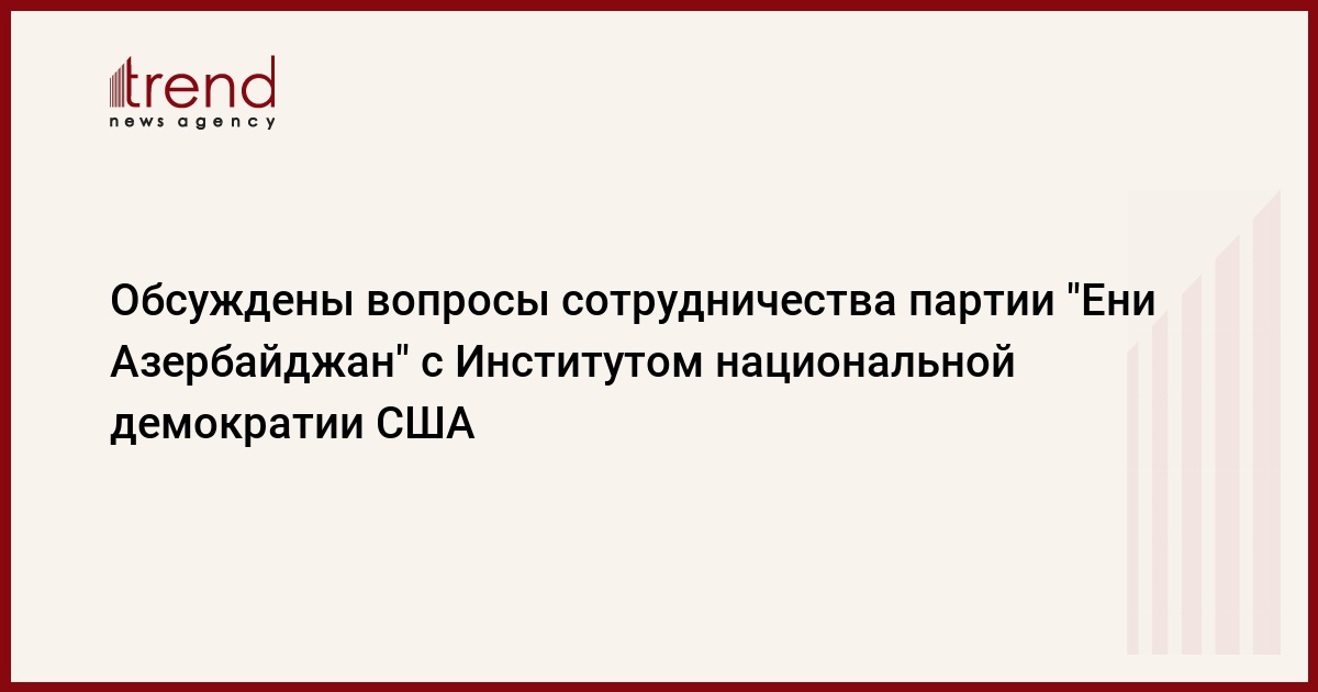 15 марта заместитель председателя партии "Ени Азербайджан" (ПЕА), исполнительный секретарь Али Ахмедов встретился с новым директором бакинского офиса Института национальной демократии (ИHД) США Эмили Шульц и главным программным менеджером Вашингтонского офиса ИHД Томасом Вари. Об этом Trend сообщили в пресс-службе ПЕА.