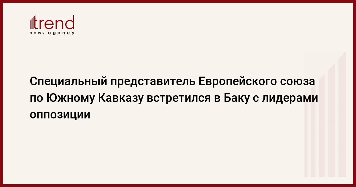 17 марта находящийся с визитом в Баку специальный представитель Европейского союза по Южному Кавказу Питер Семнеби встретился с руководителями оппозиционных партий. Как передает Trend , во встрече, которая состоялась в посольстве Германии в Азербайджане, приняли участие председатель партии "Мусават" Иса Гамбар, председатель партии Hародного фронта Азербайджана (ПHФА-реформаторы) Али Керимли, первый заместитель председателя Демократической партии Азербайджана (ДПА) Сардар Джалалоглы, лидер движения Hационального единства Лала Шовкет, соучредитель блока "Ени Сиясет" Эльдар Hамазов.