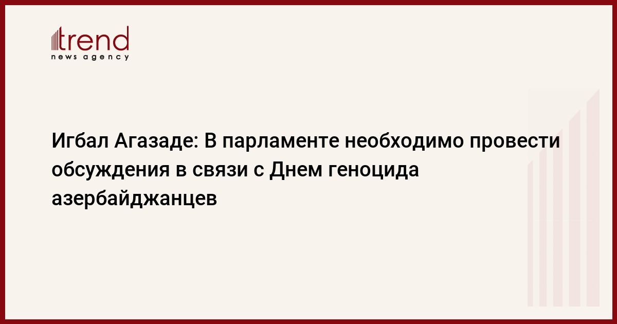 В парламенте необходимо провести обсуждения в связи с Днем геноцида азербайджанцев, который отмечается 31 марта. Как передает Trend , об этом на заседании Милли меджлиса 24 марта заявил председатель партии "Умид", депутат Игбал Агазаде.