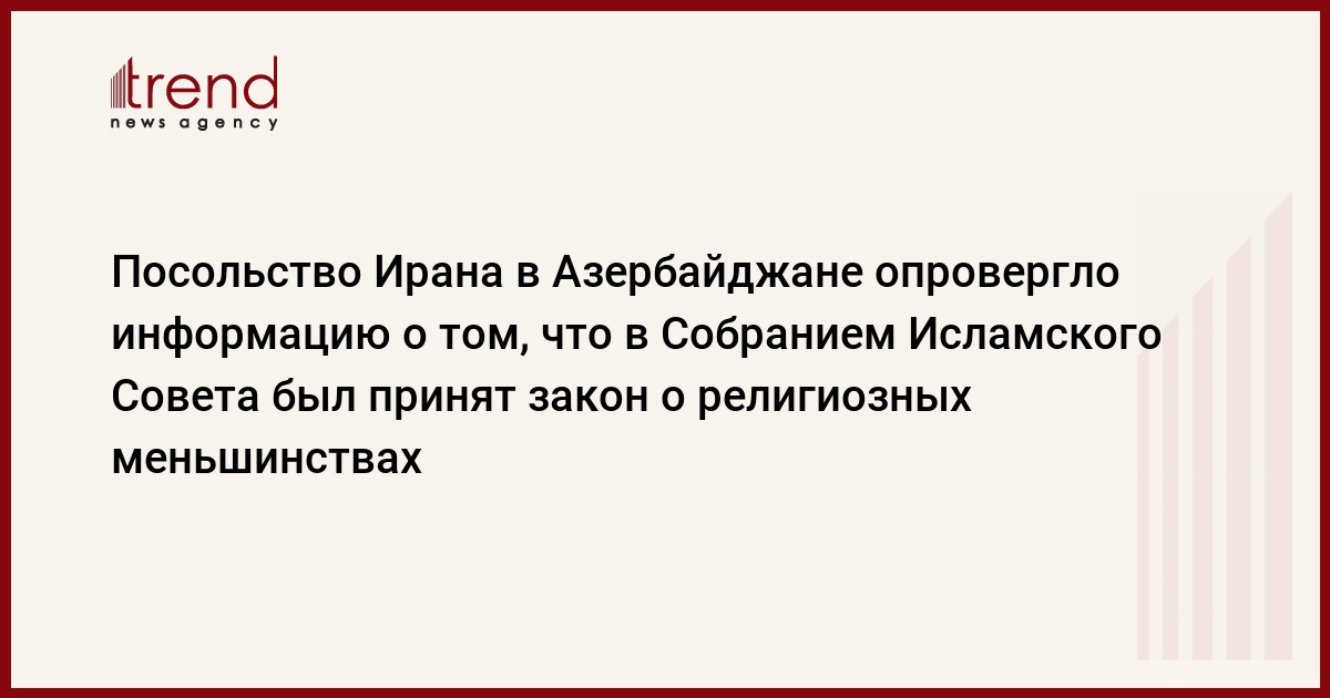 Дипломатическое представительство Исламской Республики Иран опровергло информацию о том, что Собрание Исламского Совета приняло закон, по которому представители религиозных меньшинств страны должны носить на одежде знаки, отличающие их от мусульман. Как сообщили Trend в посольстве Ирана в Азербайджане, распространяемая некоторыми американскими газетами информация является ложью и клеветой.