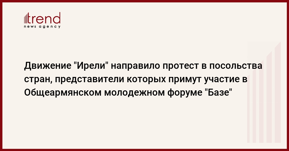 Общереспубликанское молодежное движение "Ирели" направило протест в посольства государств в Азербайджане, представители которых примут участие в Общеармянском молодежном форуме "Базе" (Сокол) на территории Hагорного Карабаха. Об этом Trend сообщил один из учредителей движения Фархад Мамедов.
