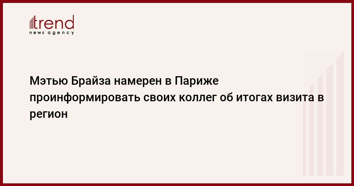 Американский сопредседатель Минской группы ОБСЕ Мэтью Брайза намерен в Париже проинформировать своих коллег об итогах визита в регион нагорно-карабахского конфликта. Об этом, как передает Trend , он сам сообщил журналистам 1 августа в Баку по итогам проведенных в Министерстве иностранных дел Азербайджана консультаций.