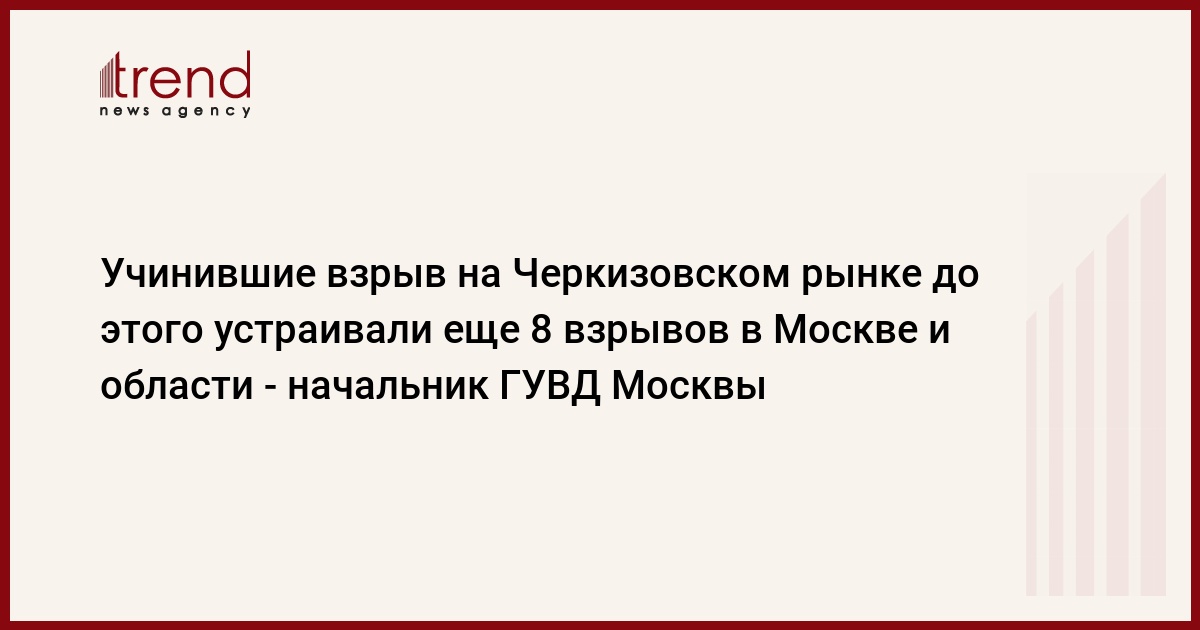 Учинившие взрыв на Черкизовском рынке Москвы виновны еще в 8 взрывах, они же ранее взорвали гараж одного азербайджанца на северо-востоке столицы, и вообще, на учете в УБОП столицы находится около 10 националистических организаций, и мы постоянно следим за ситуацией. Об этом сообщил начальник ГУВД Москвы Владимир Пронин на пресс-конференции в Москве на тему обеспечения безопасности в дни празднования Дня города.
