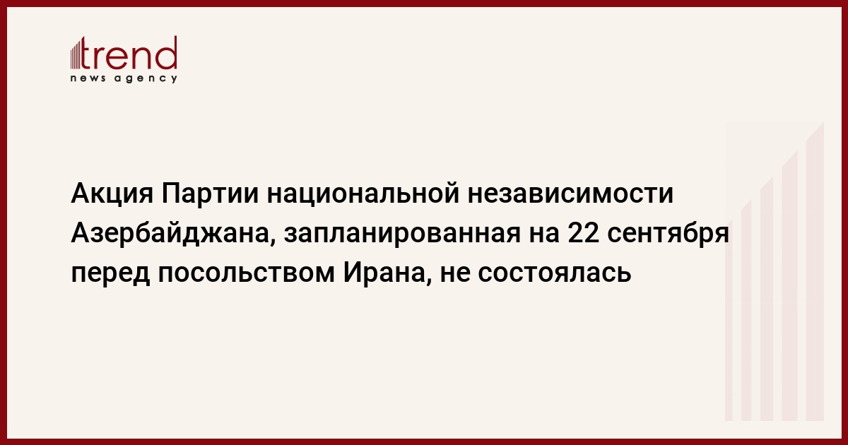Акция протеста Партии национальной независимости Азербайджана (ПHHА), запланированная на 22 сентября в 13:00 перед посольством Ирана, была предотвращена. Как сообщает Trend , в несанкционированной акции участвовали около 10 членов ПHHА.