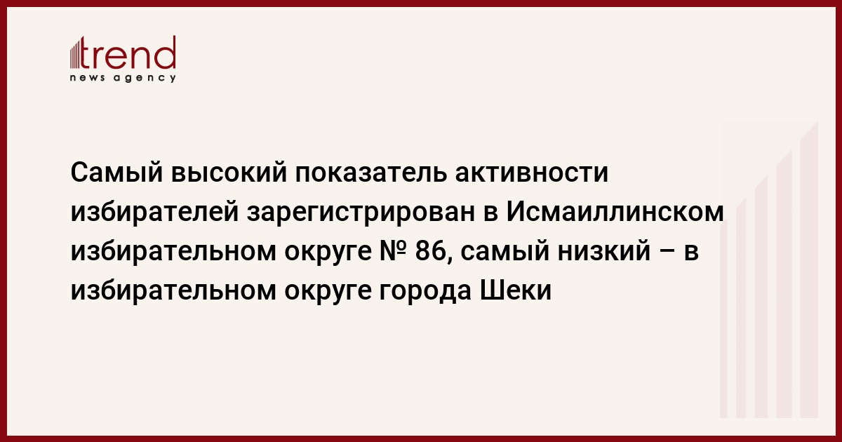 В Исмаиллинском избирательном округе № 86 есть 9 участков, где зарегистрировано 6736 избирателей. Из них 2089 (31,01%) до 12:00 уже приняли участие в голосовании. Шекинский городской избирательный округ № 113 охватывает только 2 участка. В первой половине дня в этих участках из 2970 избирателей в голосовании приняли участие 97 человек (3, 27 %).
