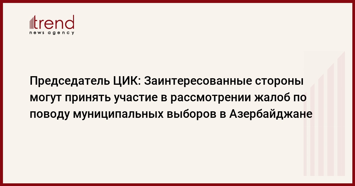 "Представители международных организаций и других заинтересованных сторон могут принять участие в рассмотрении поступивших в ЦИК жалоб по поводу повторных, дополнительных, новых и первых муниципальных выборов, которые состоялись 6 октября". Как передает Trend , об этом 11 октября заявил председатель Центральной избирательной комиссии (ЦИК) Мазахир Панахов на заседании комиссии.