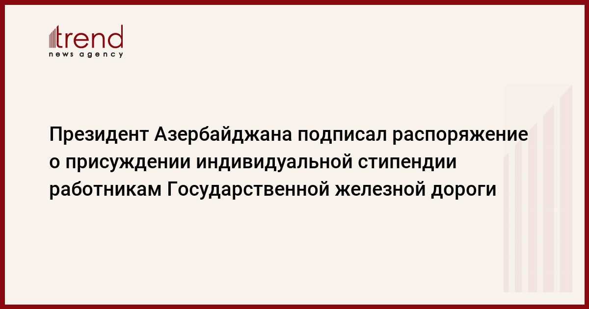 12 октября президент Азербайджана Ильхам Алиев подписал распоряжение о присуждении индивидуальной стипендии работникам Государственной железной дороги за заслуги в развитии транспортной системы страны, передает Trend .